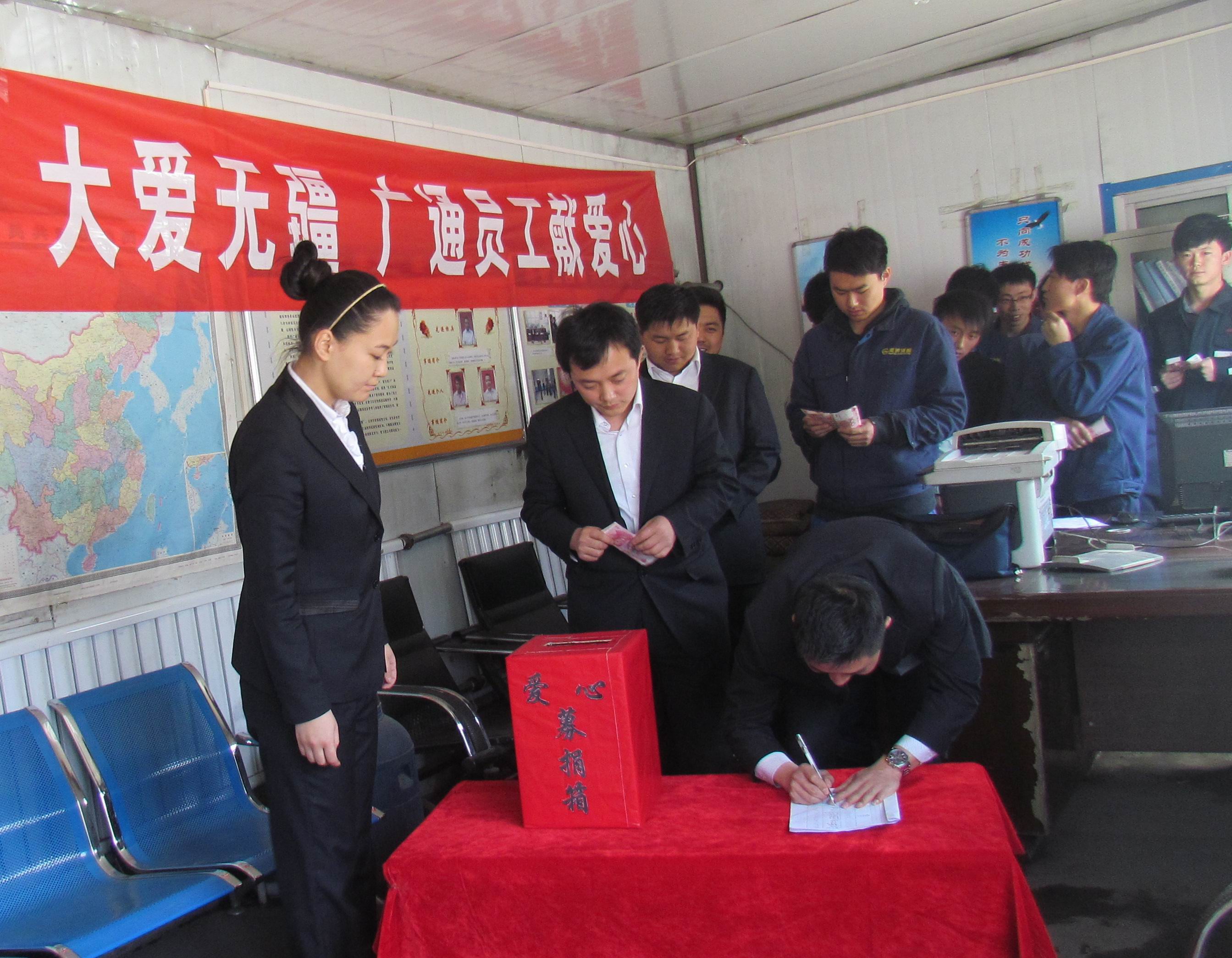 4月22日是“4.20”雅安大地震后的第一個(gè)工作日,陜西廣通運(yùn)輸發(fā)展有限公司及時(shí)在全轄組織開展了“‘情系雅安’為地震災(zāi)區(qū)捐款活動(dòng)”,號(hào)召全體員工積極參與,踴躍向?yàn)?zāi)區(qū)捐款。公司全轄4個(gè)分公司、7個(gè)辦事處共335名員工積極響應(yīng)。各單位根據(jù)各自實(shí)際,精心組織安排,機(jī)關(guān)辦公室、各礦調(diào)運(yùn)部、結(jié)算網(wǎng)點(diǎn)及停車場工作間都成了募捐點(diǎn),廣大員工及司機(jī)朋友自發(fā)主動(dòng)為災(zāi)區(qū)人民供獻(xiàn)自己的愛心。大約一小時(shí)之內(nèi),公司已累計(jì)收到捐款121080元。